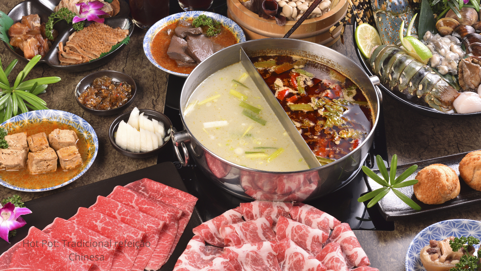 O Hot Pot chinês, conhecido como “huǒ guō” (火锅) em mandarim, é uma refeição tradicional e socialmente interativa, muito popular na culinária chinesa. É uma espécie de panela compartilhada que é colocada no centro da mesa, onde os participantes cozinham uma variedade de ingredientes frescos em um caldo fervente